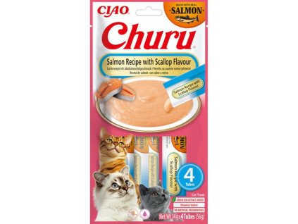 Churu masové pyré pro kočky s lososem a hřebenatkou. Lahodný, přírodní pamlsek krémové konzistence bez obilovin.