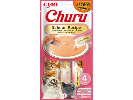 Churu masové pyré pro kočky s lososem . Lahodný, přírodní pamlsek krémové konzistence bez obilovin.
