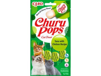 Churu Pops jsou neodolatelná masová lízátka pro kočky s kuřecím z farmářského chovu a divokým mořským tuňákem.
