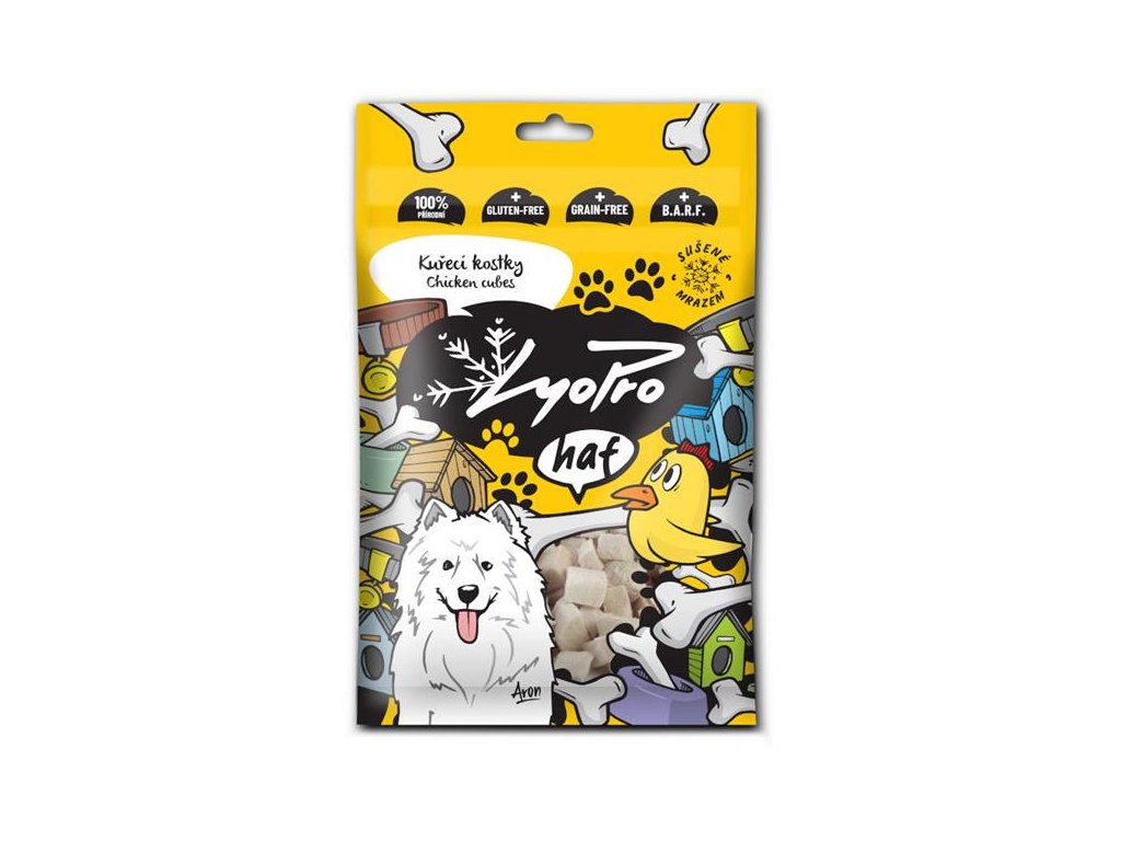Při lyofilizaci neprochází maso vysokými teplotami, a proto si uchová maximum vitamínů, minerálů a nutričně hodnotných látek. Jde o ideální volbu pro BARF (krmení syrovou stravou), psí alergiky a celiaky. Další výhodou sušení mrazem je dlouhá trvanlivost. Kuřecí kostky obsahují 100 % kuřecího masa bez přidané chemie, obilnin, konzervantů a jiných balastních látek. Jde tak o zdravou, lehkou a výživnou odměnu.